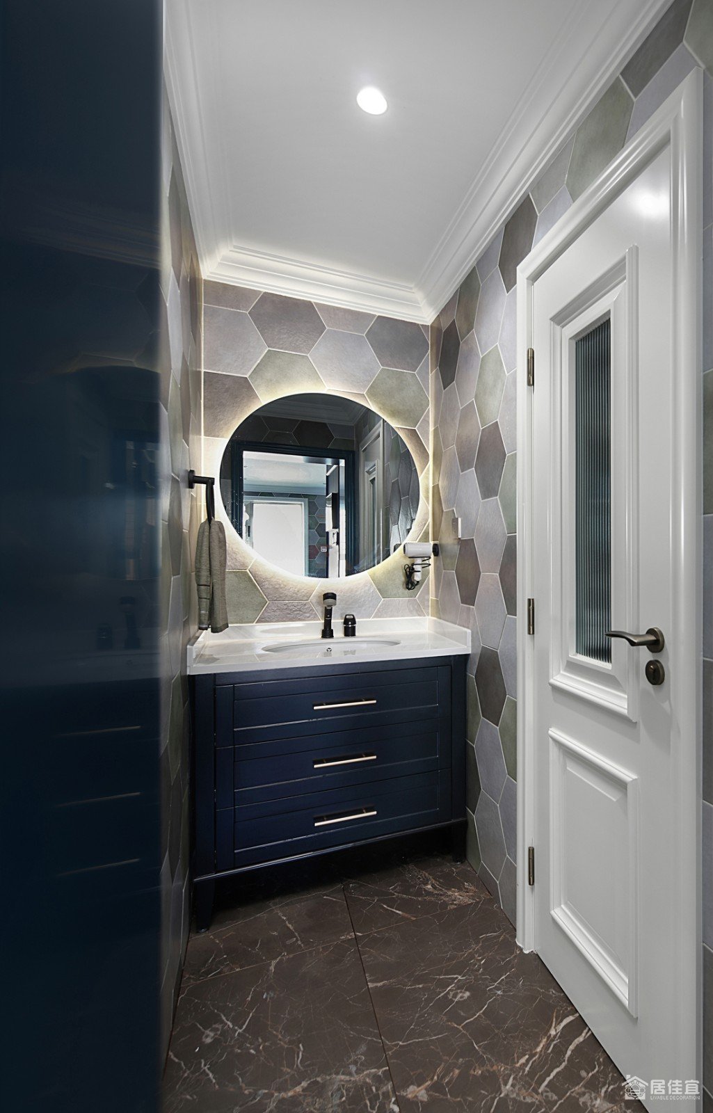 蓝白相间的墙面将入户后的整体空间连通在一起,摆脱了原户型拥挤的感觉,使人疲倦的内心得以放松,瞬间让身心都回家。
