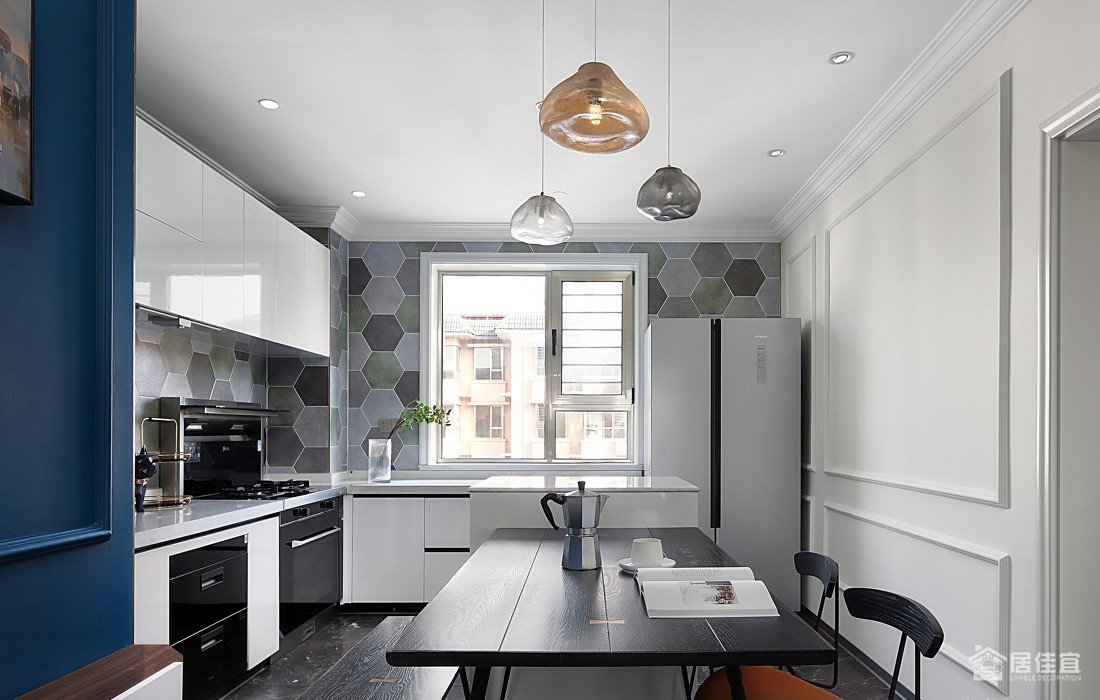 秉承着简约、复古的特色,深、浅基调的餐厨空间,搭配具有独特复古风与木艺碰撞融合的餐桌椅,抽象吊灯平衡空间,整体氛围平稳、安定,烂漫优雅的氛围扑面而来,散发高级感。