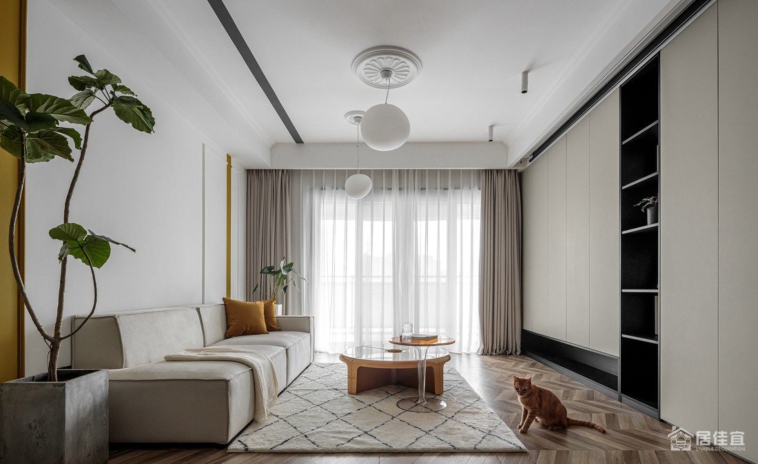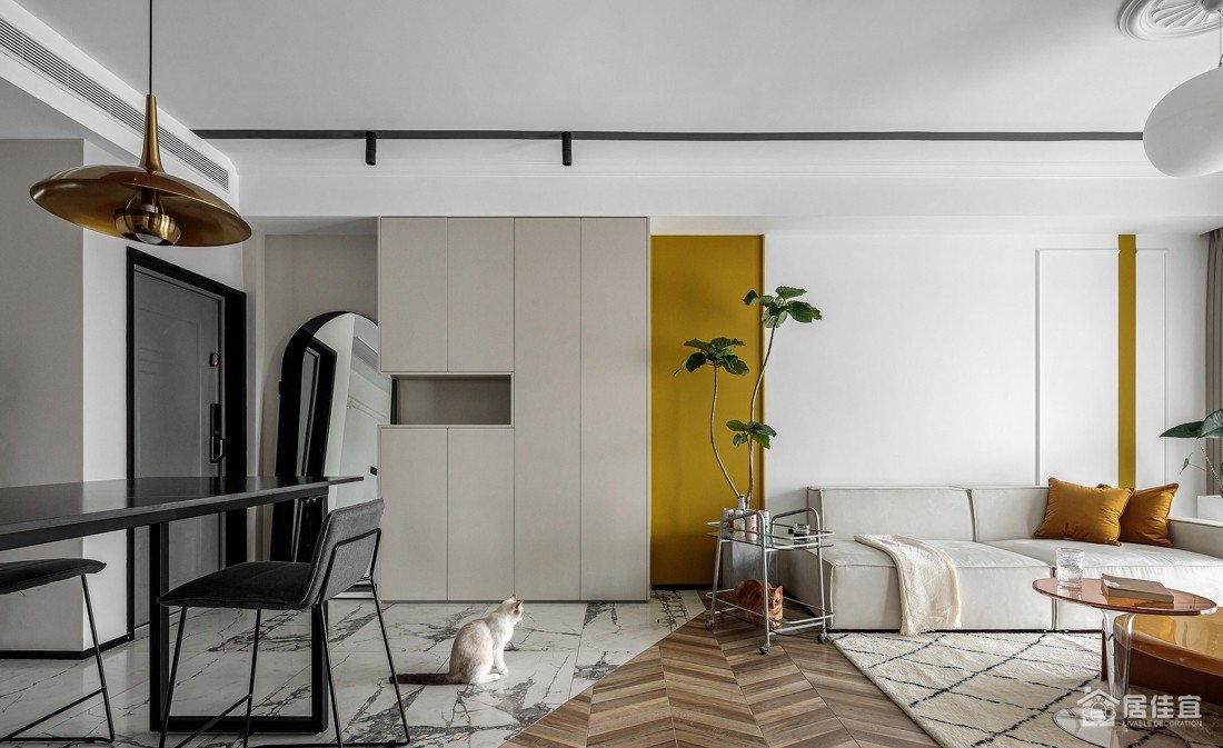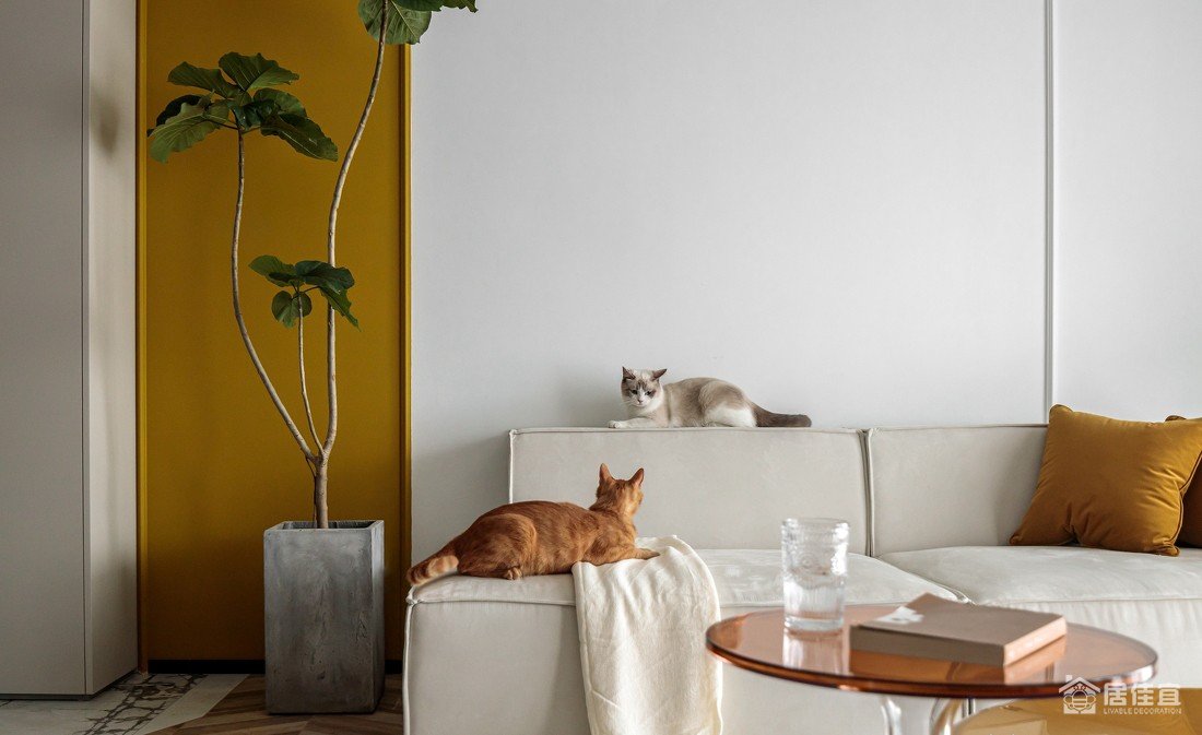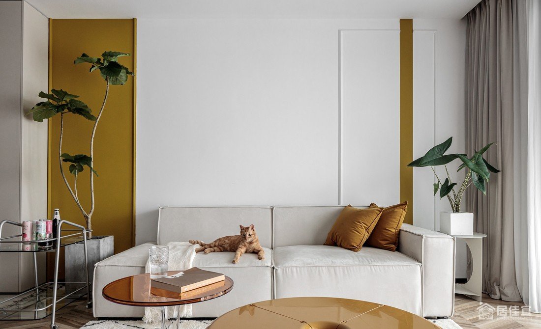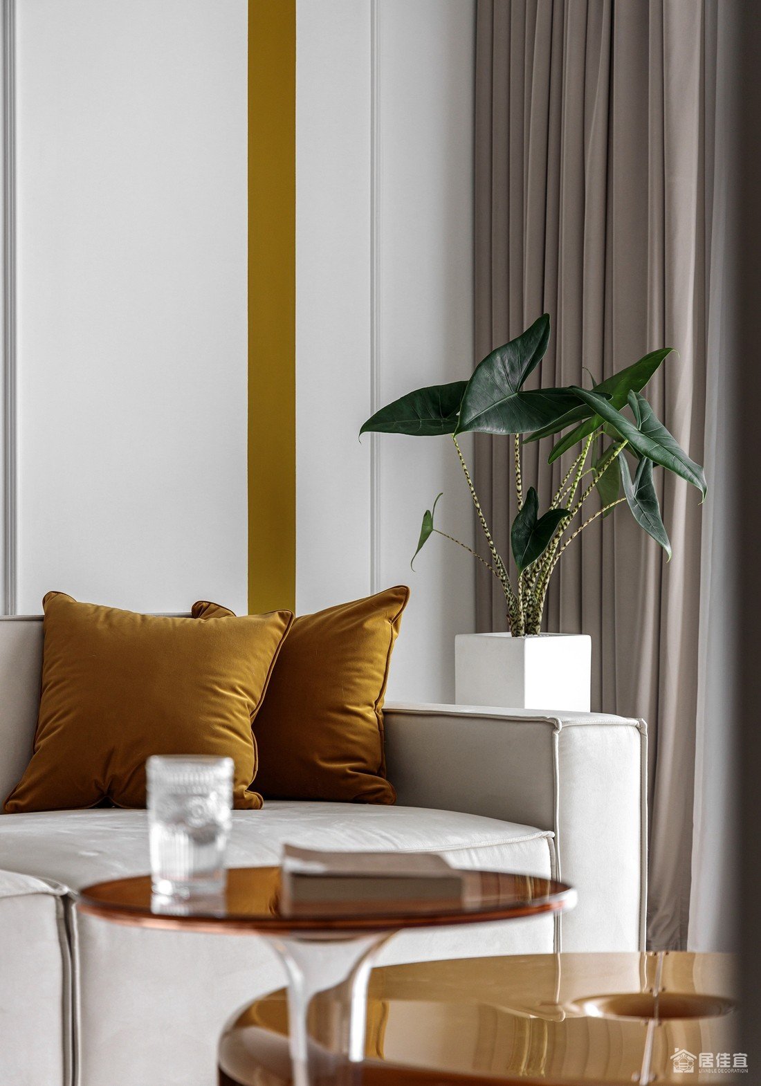 左框以分割设计手法来强调墙面存在感,右框以传统欧式石膏线作为分割,再以线作为串联。芥末黄作为背景色进行填充,沙发、边几则无需过多的装饰便可以达到高级而艺术的效果。烧橙色亚克力咖啡桌的加入,客厅空间获得了完美的对比度。