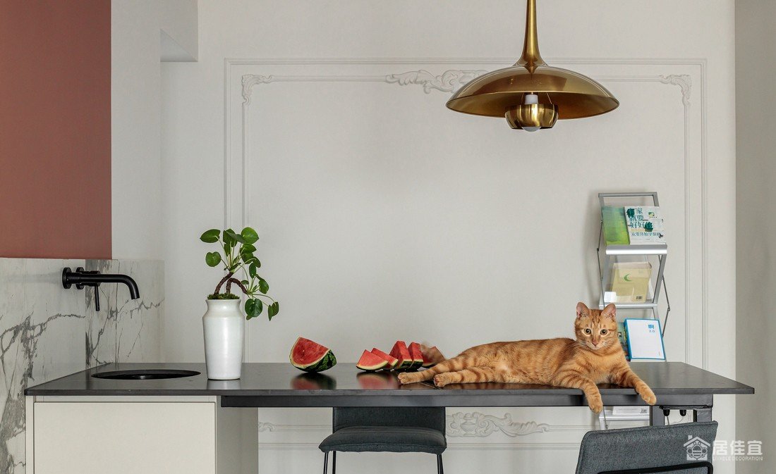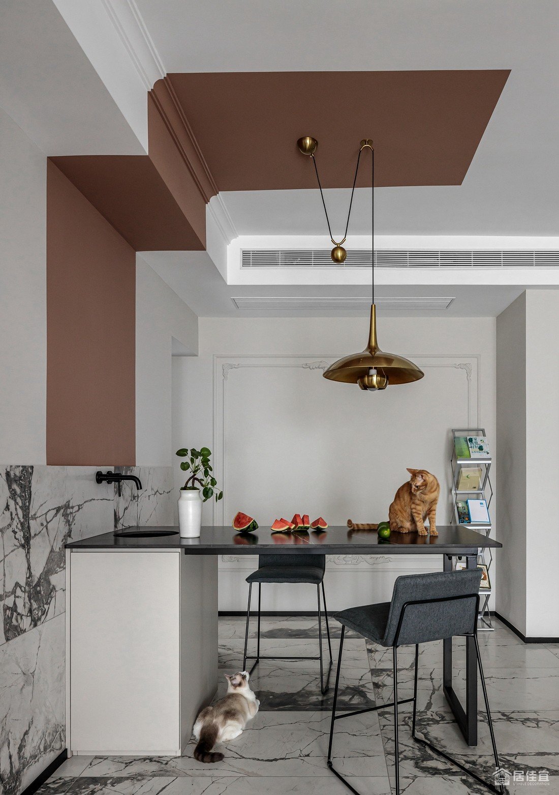 回家休息时,屋主会做一些轻食简餐,所以餐厅空间设计为中岛(带水盆)+高台面。满足生活需求的同时去制造区别与传统设计的反差感。从左侧墙体延伸的画眉鸟棕色块作为餐厅区域的中心元素,在视觉上强调区域性,背景墙设计为角花造型石膏线,富有西式色彩文化,并与客厅墙面串联呼应。