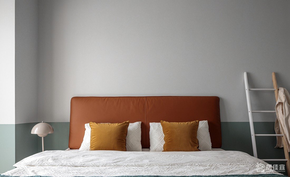 皮革棕、灰绿色、蒸汽灰三色的搭配,简洁有力,制造出如云般的轻柔舒适感。床头的一侧,是丹麦的Flowerpot灯,它能在任何空间条件下创造出安静又时髦的氛围。