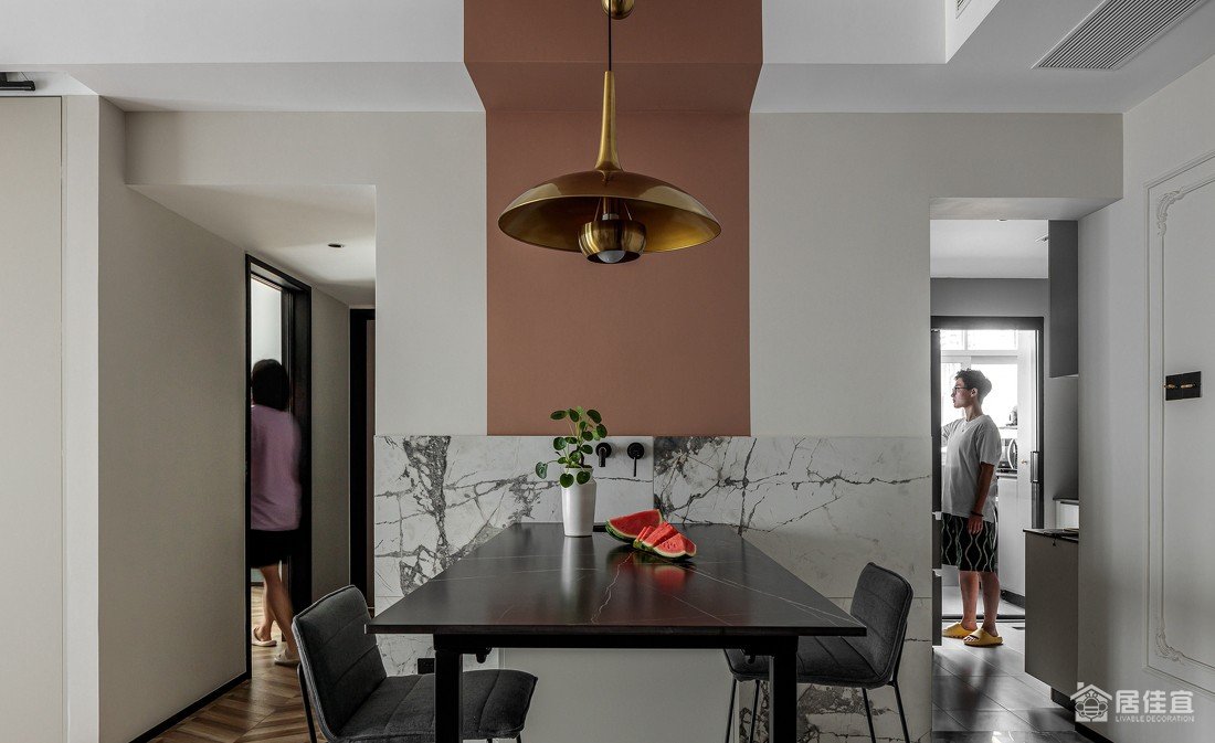 整套案列想表达一种玩反差的设计心态,抛开传统的生活方式,用不受定义的态度来营造家的氛围。入户第一眼地面斜面异形鱼骨拼木纹砖+寒江雪大理石砖的拼接关系,以及第二眼餐厅墙面画眉鸟棕的色块凸显+非常规餐桌展现方式,最后利用公共区域完全打开之后的流畅通感,让空间在不断地反差性质中应运而生。
