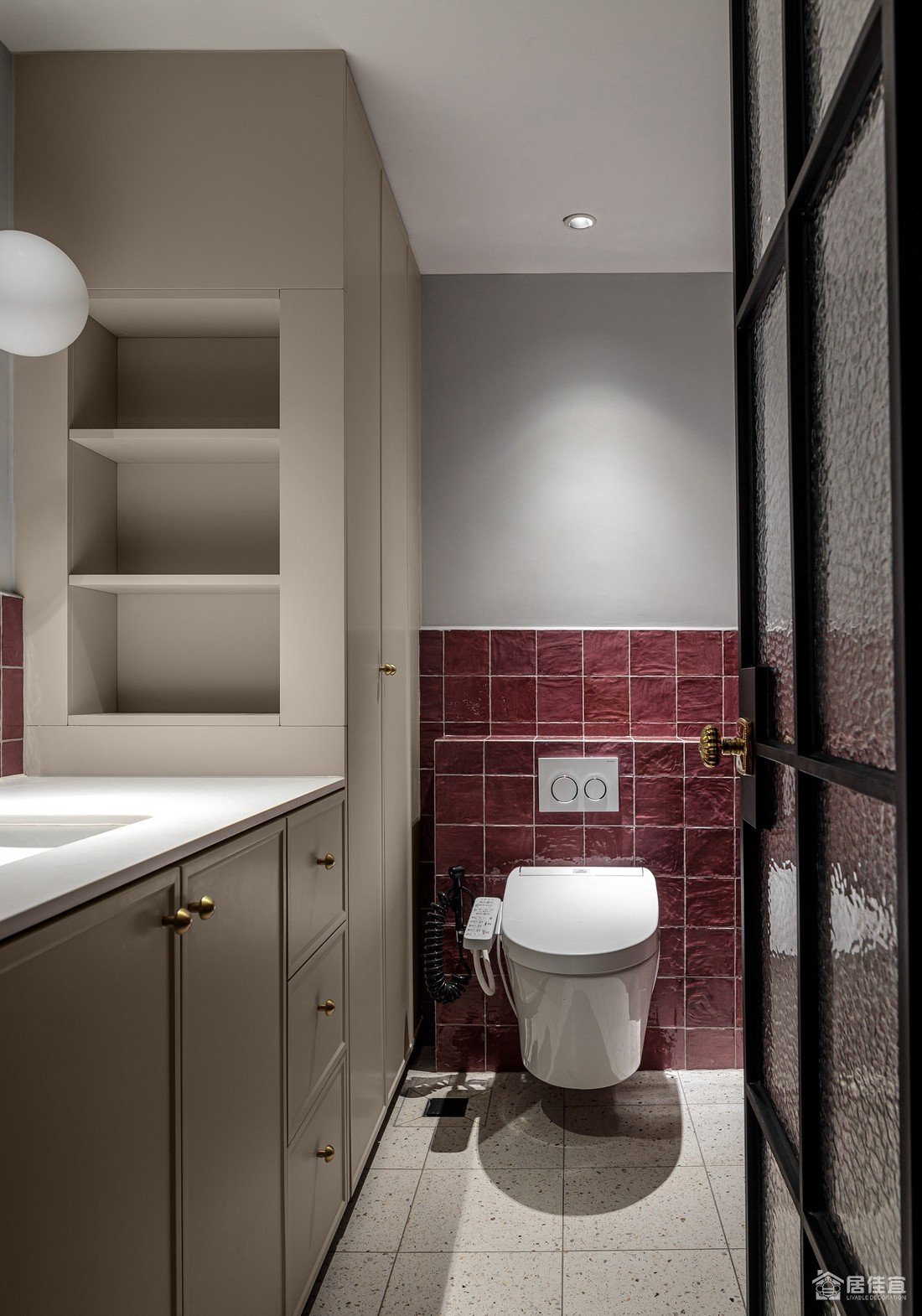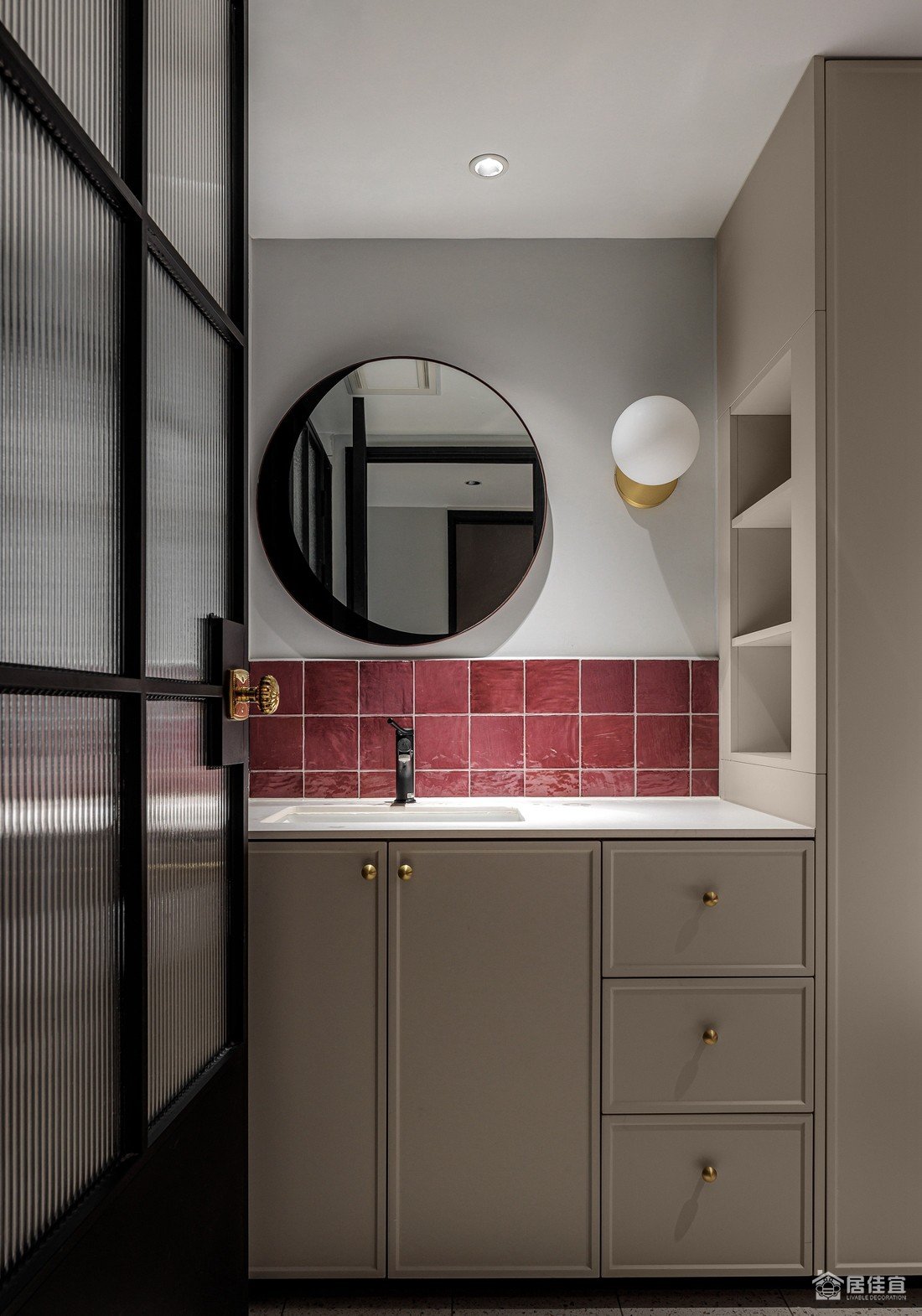 原始卫生间无独立窗户和干湿分区,借临近次卧1.5m2让其功能完善。黄铜、艺术玻璃、绛紫色小砖、以及延续入户风格的镜面,层叠有致,用一系列精心的细节,将复古与现代进行融合。