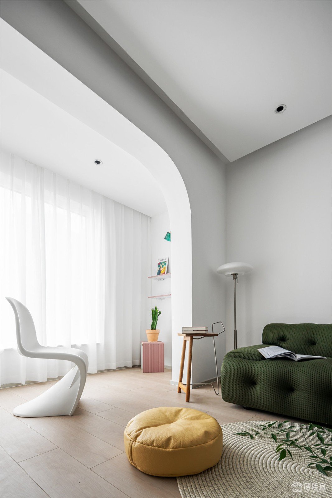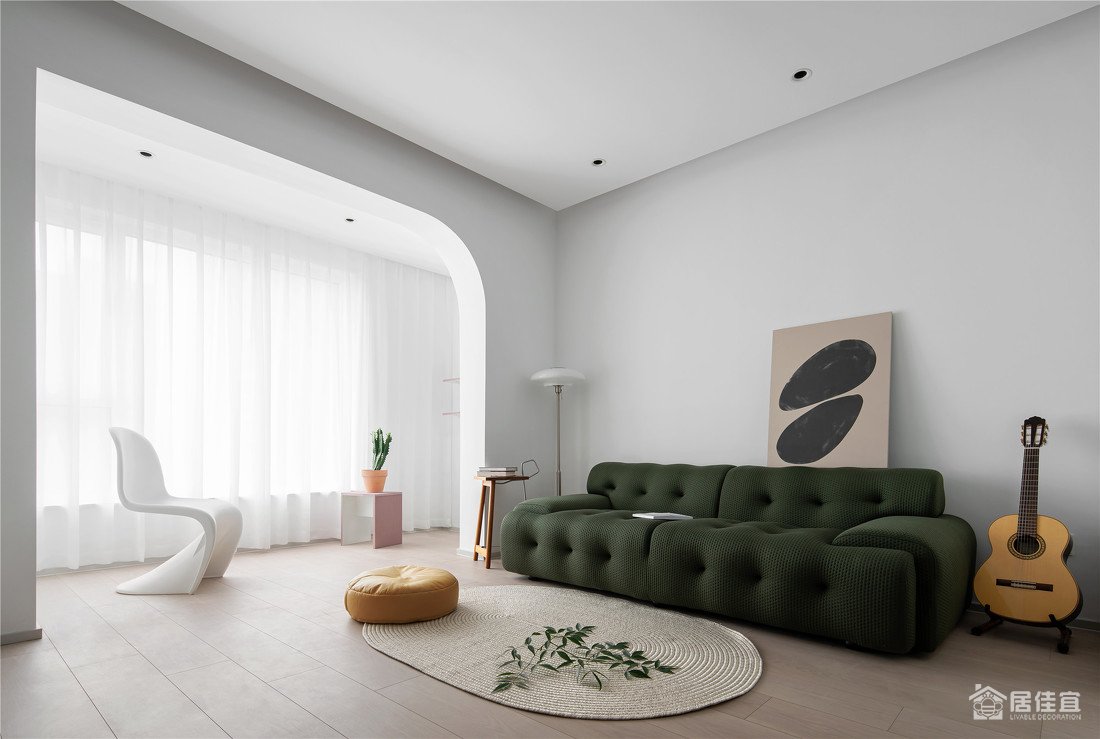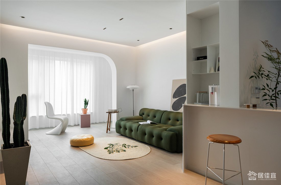 客厅和阳台之间的移门拆除,是小户型的必须,空间一下开阔了很多,这个弧度处理用来弱化承重墙和梁之间的生硬,潘东椅的弧线之美真是绝。