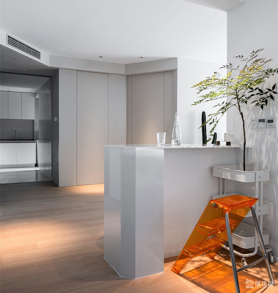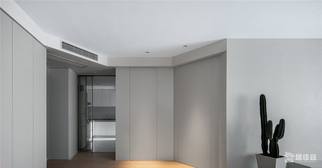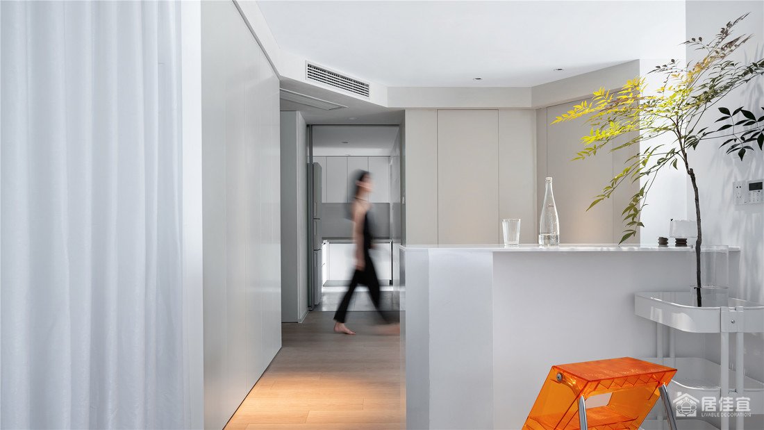 开门入户看起来没有过多的修饰,但是时时都透露着我们的一点小心机—「隐形门」,原始户型主卧开门正对大门,私密性不是很好,经过改动做了一个隐形门的设计,形成了一体化的墙面,且可以自动关门,美观实用。意在向业主传达一种繁中有简的设计理念,也满足业主对于简单时尚的追求。