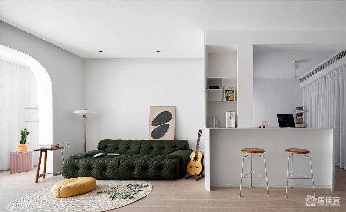 阳台门洞做弧度设计,让整个空间温柔了起来 一如小主的温婉的性情。吊顶处预留投影幕布安置空间,闲暇时约上三五好友 在家看一场院线电影,这就是岁月静好。