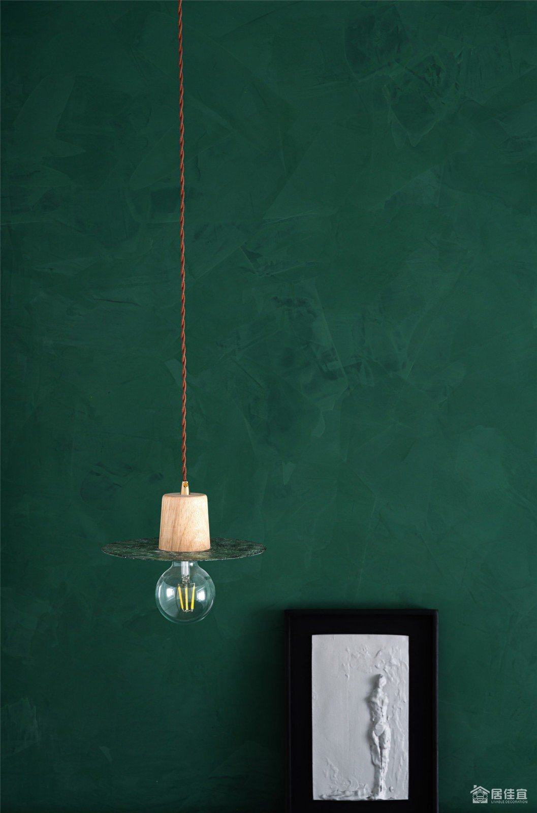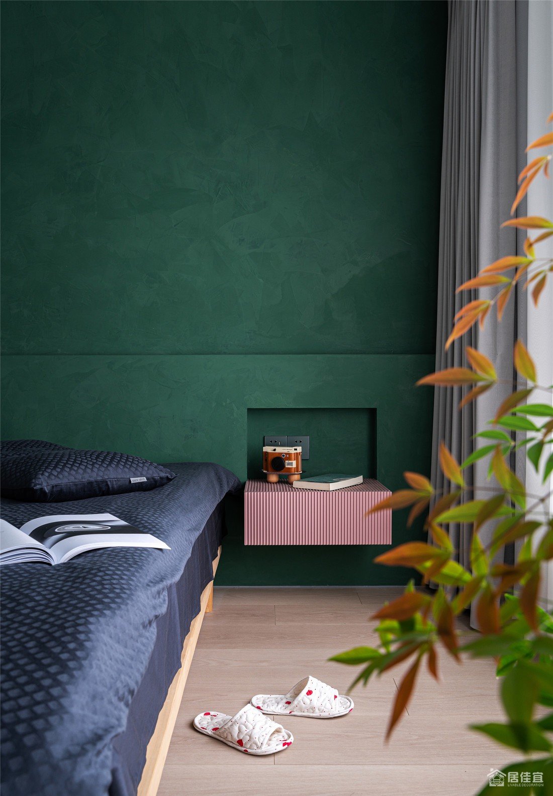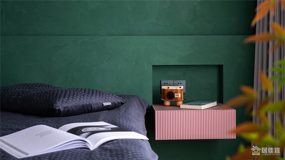卧室无靠背床配合墨绿色的艺术漆,床品,小画和吊灯,让空间表达的节制又自由,床头柜简化成一个悬空的抽屉,配合床头整体处理,视觉上很轻灵,也能满足基本需求。粉色板子是屋主很喜欢的。
