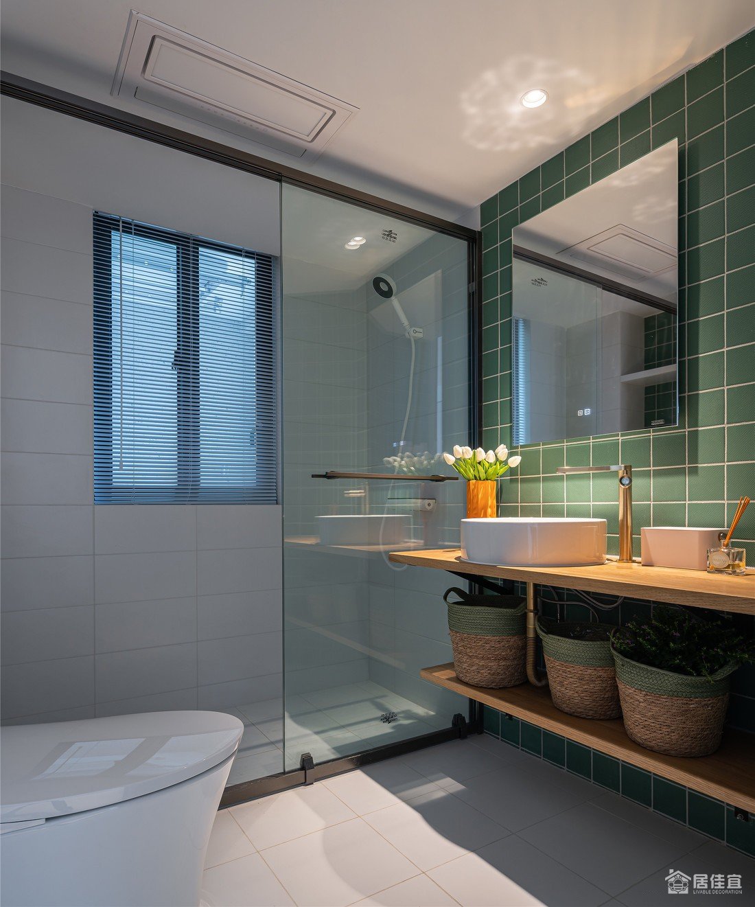 卫生间台盆处 用材较多,墨绿用才石材上不仅提升其亮度,磨砂感的触感搭配光洁的镜面,让此处也有了知性。