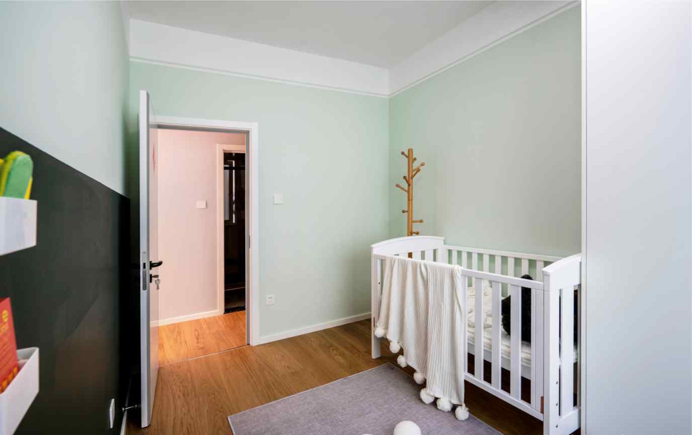 儿童房的设计上,我们以绿色为色调,相比大白墙能更好的让孩子产生对色彩的感知;放置带围挡的小床来保障孩子休息时候的安全