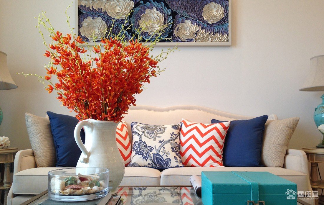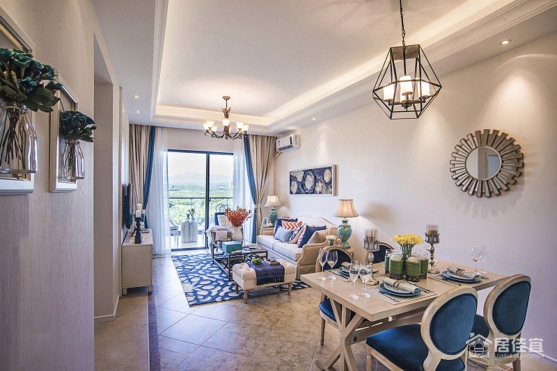 进入居所,首先是半围合式的入户花园,这里阳光充足、视野开阔,富有自然气息的饰品、看似随意的挂盘、做旧白的家具,让主人的“大自然情结”得以延伸。敞亮通透的客餐厅,以温和亲切的蓝色作为主色调,搭配象征幸福的橙色,彰显空间的尊贵与神秘之感。