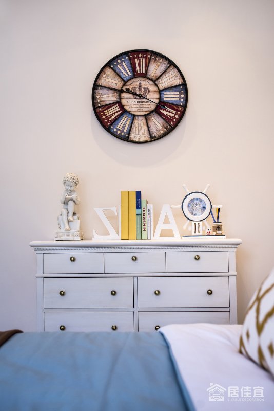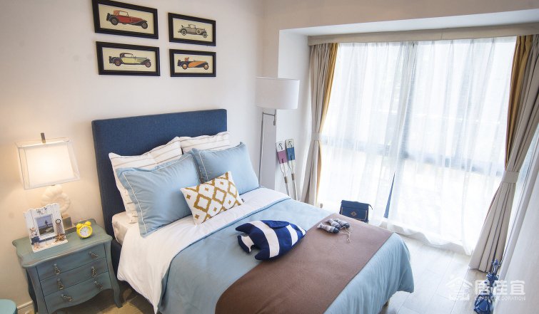 男孩房也同样取消了窗台,来增加孩子玩耍的空间。在这个区域,叶迹设计希望诠释的是自由与开阔。所以,大海般清新爽朗的蓝色充满着整个房间,简单不刻意修饰的床品、窗帘透露着清新质感,充满趣味性的挂饰、海洋元素的摆件,为孩子提供了一个有趣、自由的生活环境。