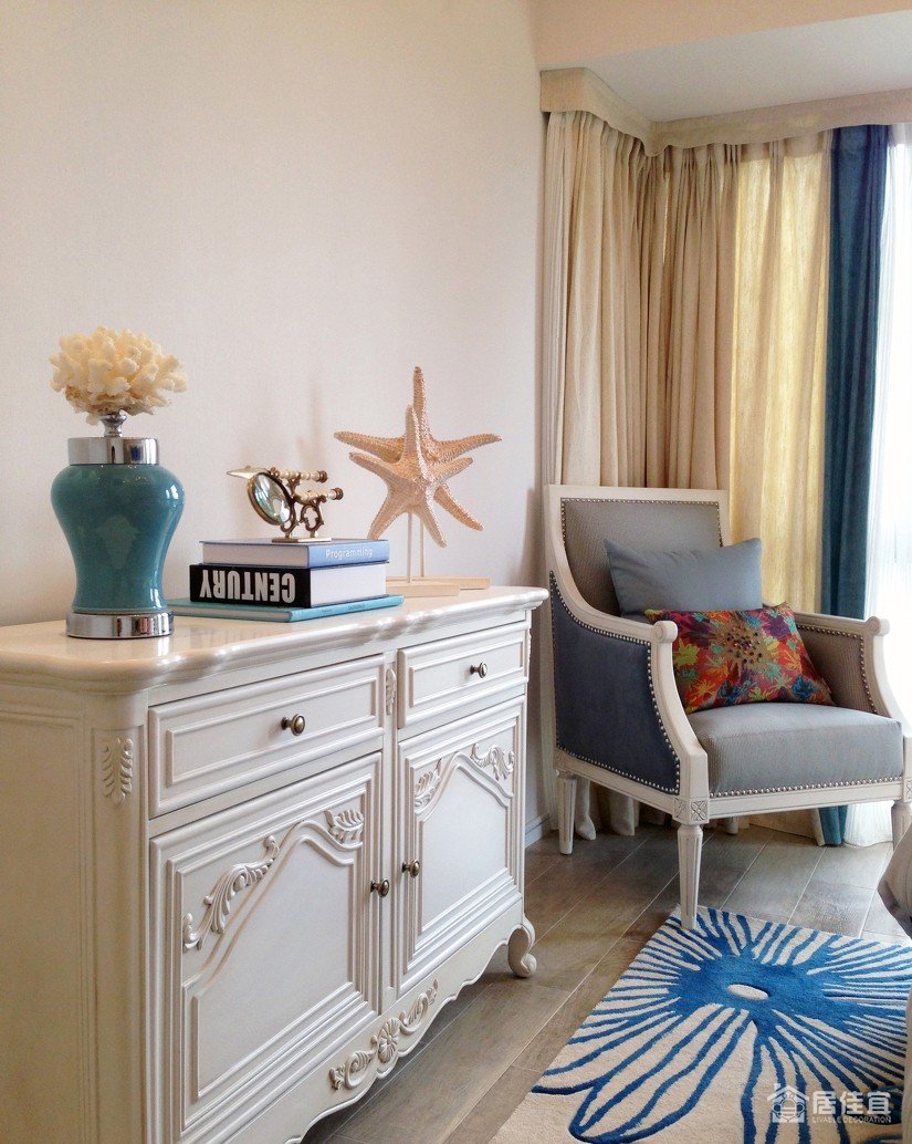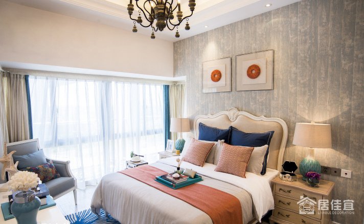 在较为私密的主卧空间,设计师将窗台取消和室内空间融为一体,不仅增加了使用面积也扩大了卧室的视野。延续了客厅的蓝橙主色调,除了称托室内外的明净之外,柔软的棉麻材质,古典雕花的家具细节,也让空间呈现出最佳状态,舒适而自由,诗意而优雅。