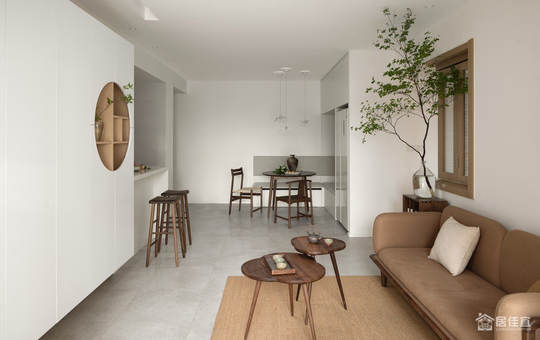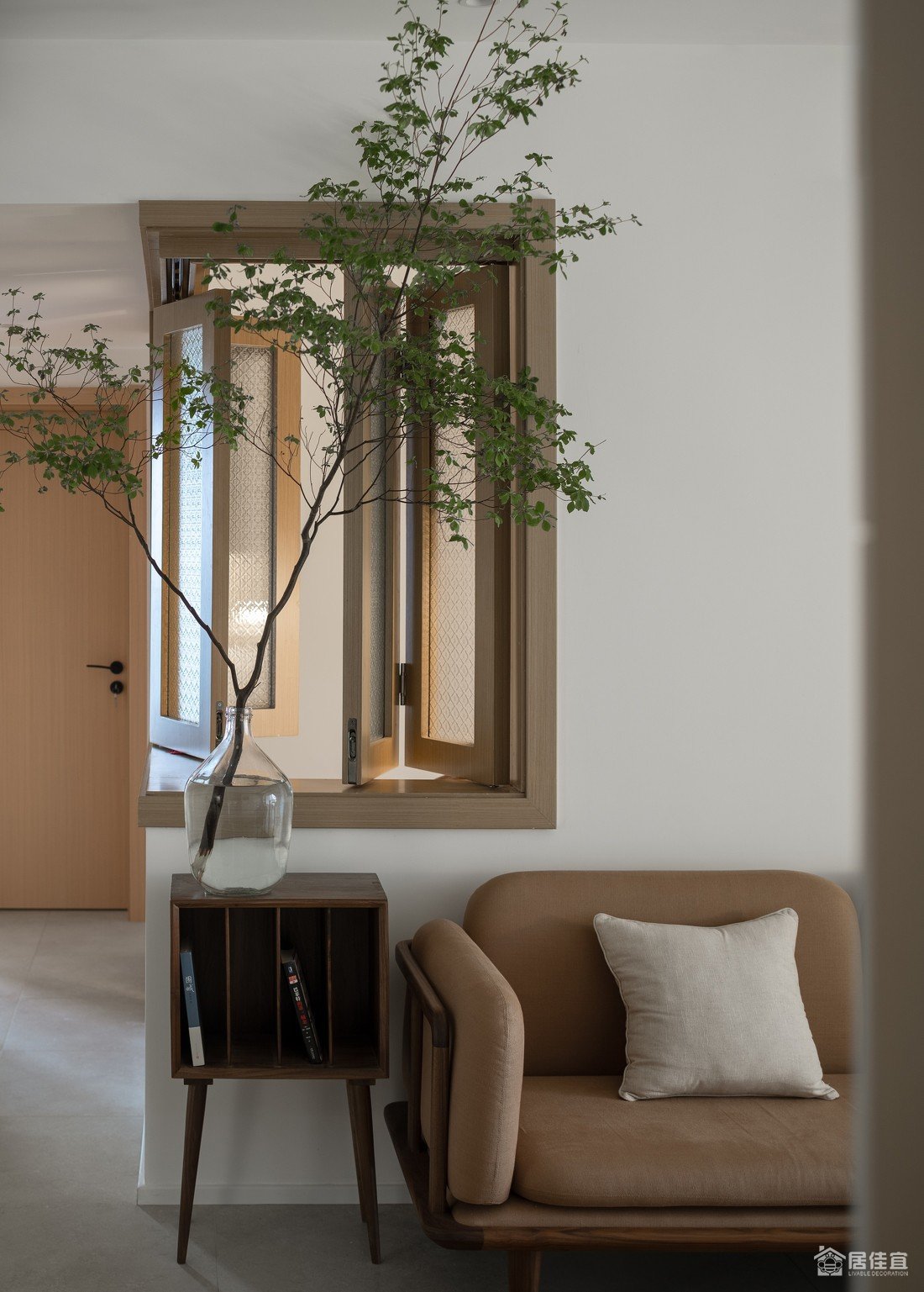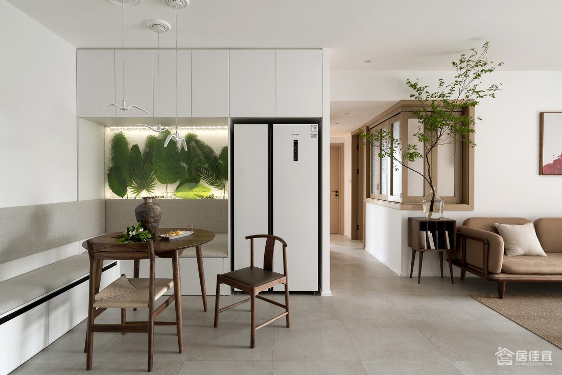 硬装的木作采用原木色+白色,软装则用黑胡桃深色提升质感。