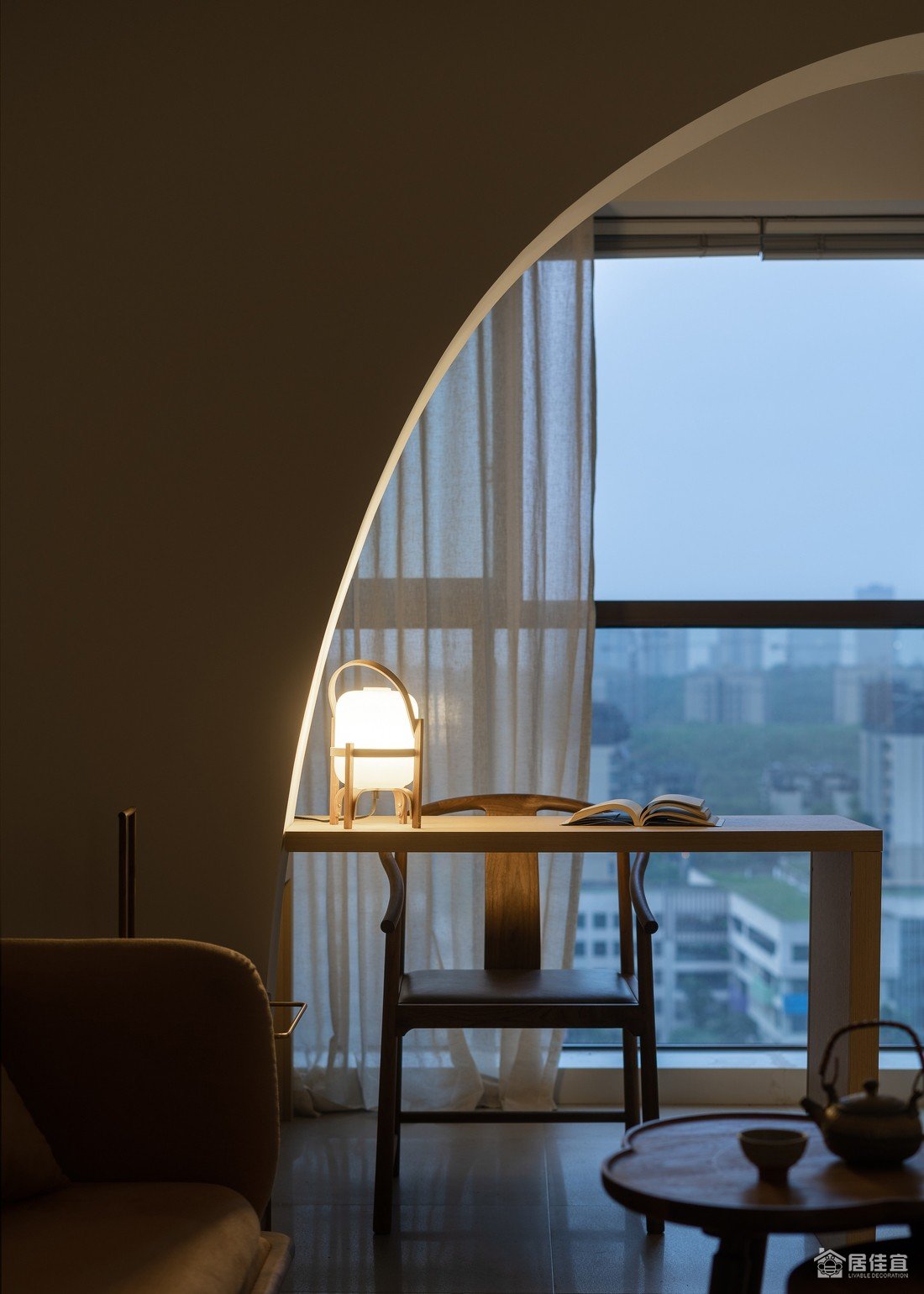 门洞下方设置的书桌,一方面是为了平衡门洞的视觉感,另一方面则是作为女主平时里写作的地方,即使在开放的空间,书桌的仪式感也能让人思如泉涌。