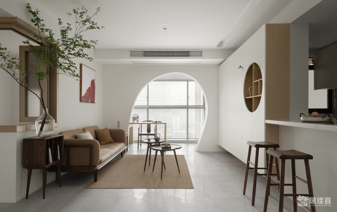 不规矩的方圆门,成为从餐厅的景墙转折到客厅阳台的亮点。