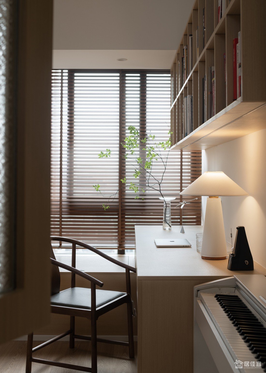 半开放式的书房,是男主的办公和阅读空间,与外界既能相互关联也能各自独立。原木窗折叠上嵌入海棠玻璃,对了来自岭南的男主而言,像是烙印上了古早的记忆。