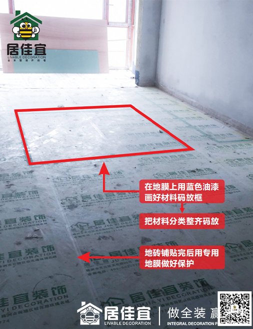 地砖铺贴完后用专用地膜做好保护,以免后期 施工过程中损坏,在地膜上用蓝色油漆画好材 料码放框,把材料分类整齐码放。