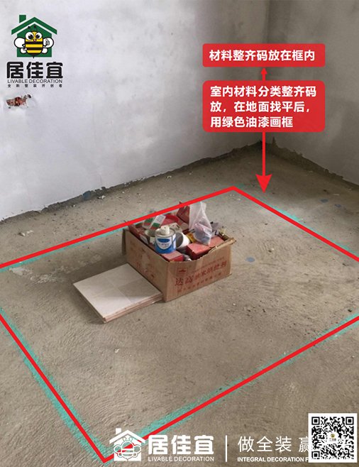 室内材料分类整齐码放,在地面找平后,用绿 色油漆画框,材料整齐码放在框内。